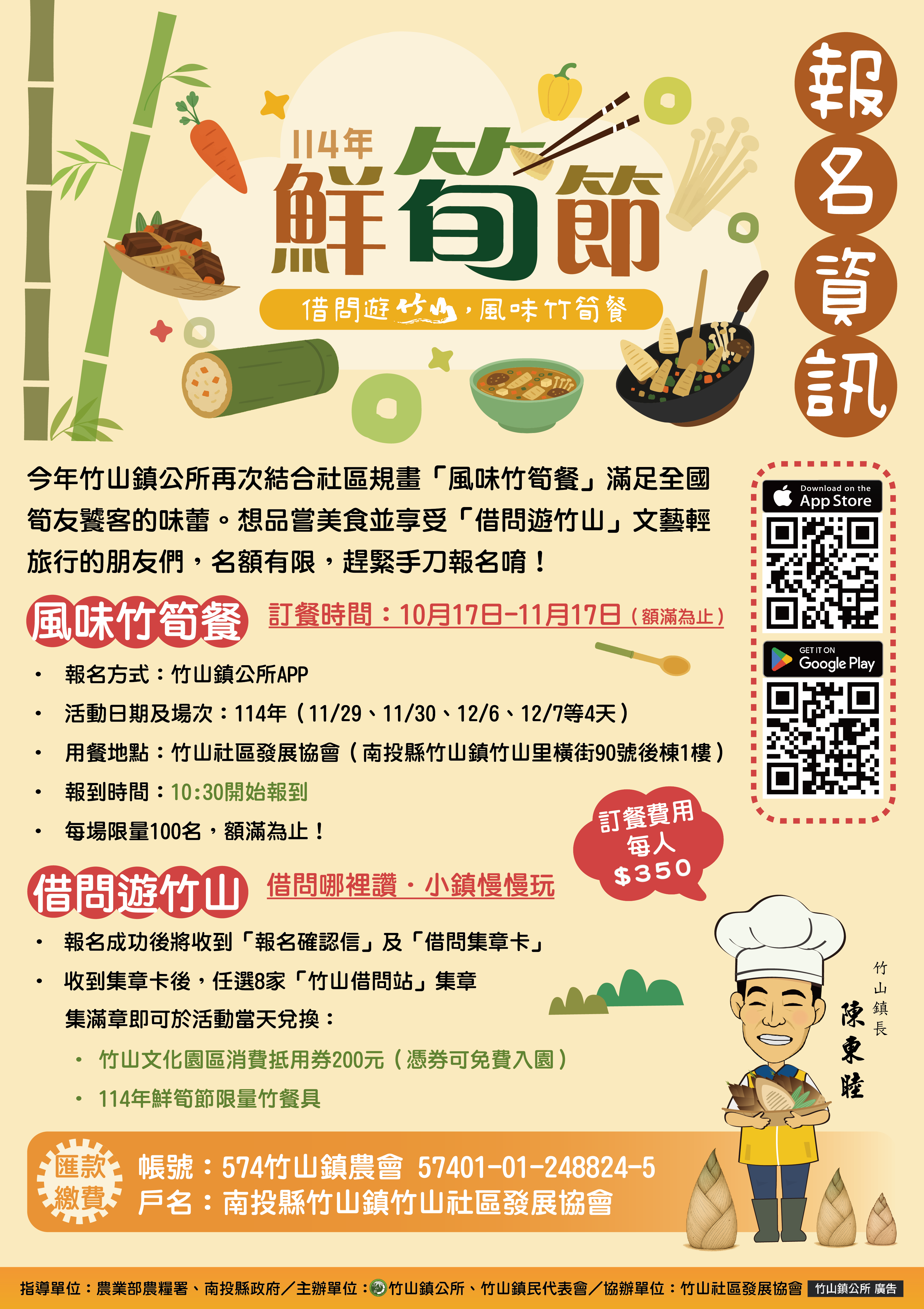 | 一、 | 本活動規畫「借問遊竹山」集章輕旅行及結合社區推出「風味竹筍餐」滿足全國筍友饕客的味蕾。 |