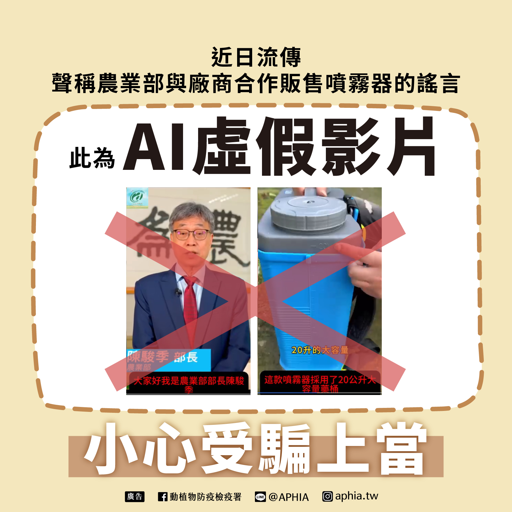 近期網路平台有發現有關農業部陳駿季部長的短影音,內容指出「農業部與廠商合作販售噴霧器」、「農業部請民眾在家進行消毒,尤其是有養家畜的」等等,農業部杜文珍次長也表示,動植物防疫檢疫署已經對外作澄清,該影片是AI剪輯變造的虛假影片,請民眾勿信。