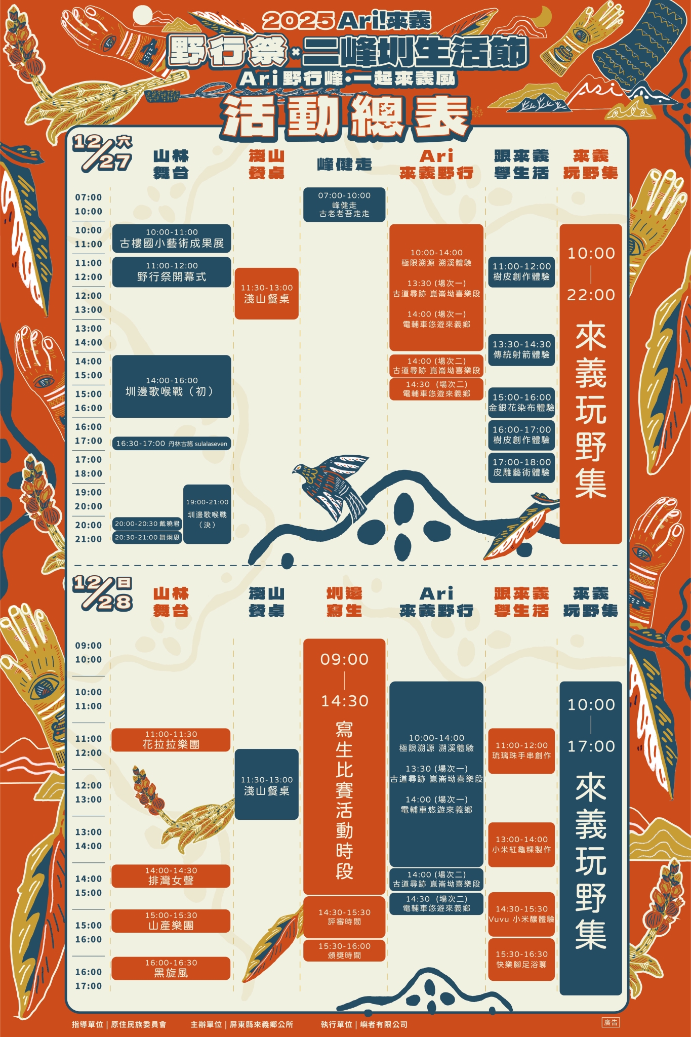 一、活動日期:114年12月27日至28日(星期六,日)共2日,活動地點古樓國小操場、太陽市集、二峰圳周邊場域;活動報名資訊請詳閱Ari來義野行臉書(網址:https://www.facebook.com/profile.php?id=61550819722608&locale=zh_TW。)