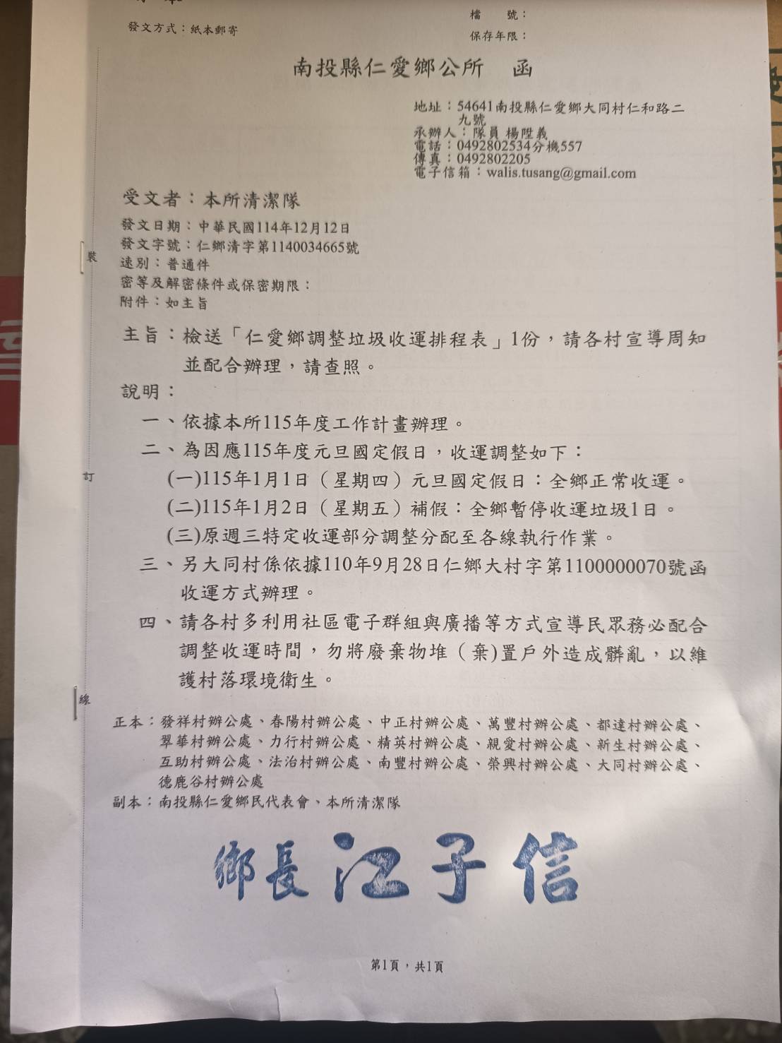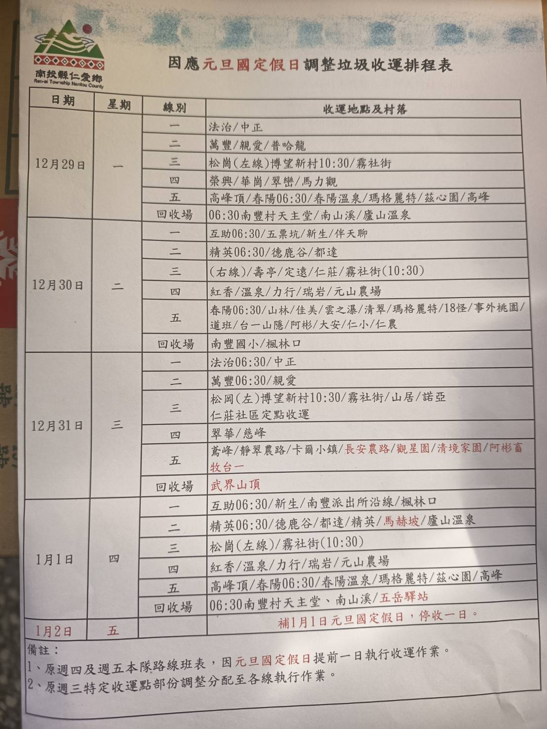【公告】因應115年元旦國定假日,收運調整期程表。