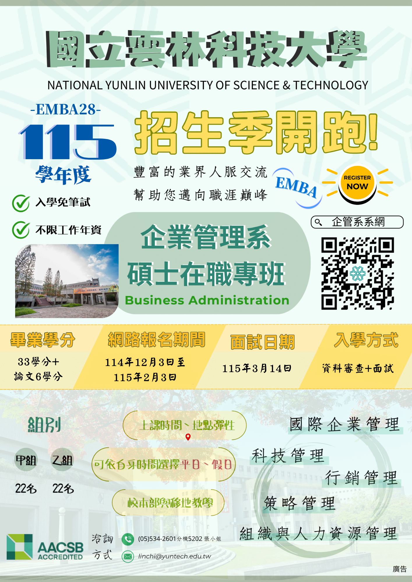 | 一、 | 網路報名期間:系統開放至115年2月3日(星期二)23時59分止。簡章下載與報名網址:https://examweb.yuntech.edu.tw/WebExams/Exam_W/(本校首頁→招生資訊→碩士在職專班)。 |