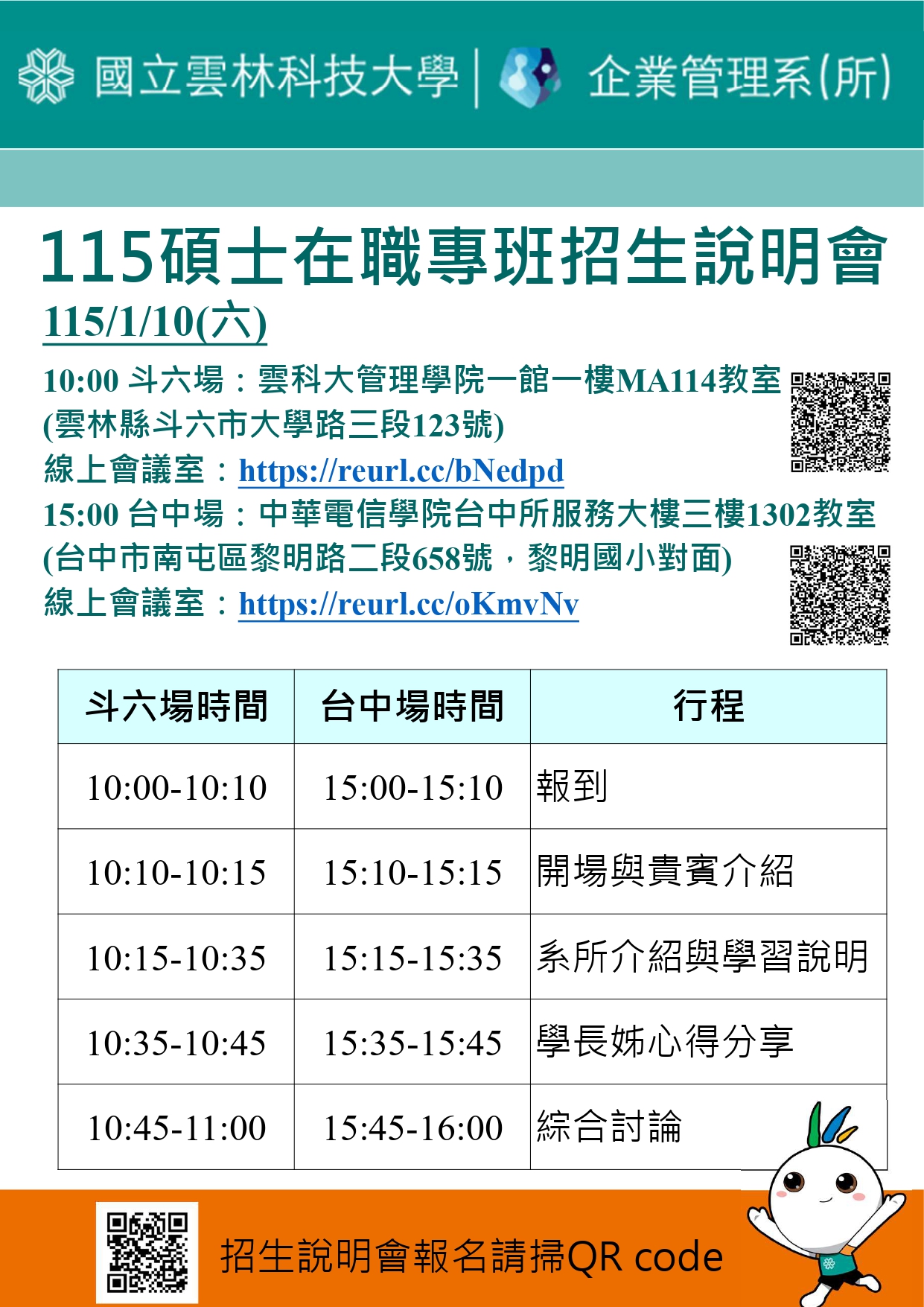 | 二、 | 第二場招生說明會日期:115年1月10日(星期六)斗六場- 上午10時至 11時、台中場下午15時-16時,報名網址:https://forms.gle/NH3VzxmXmbafhh6y7。 |