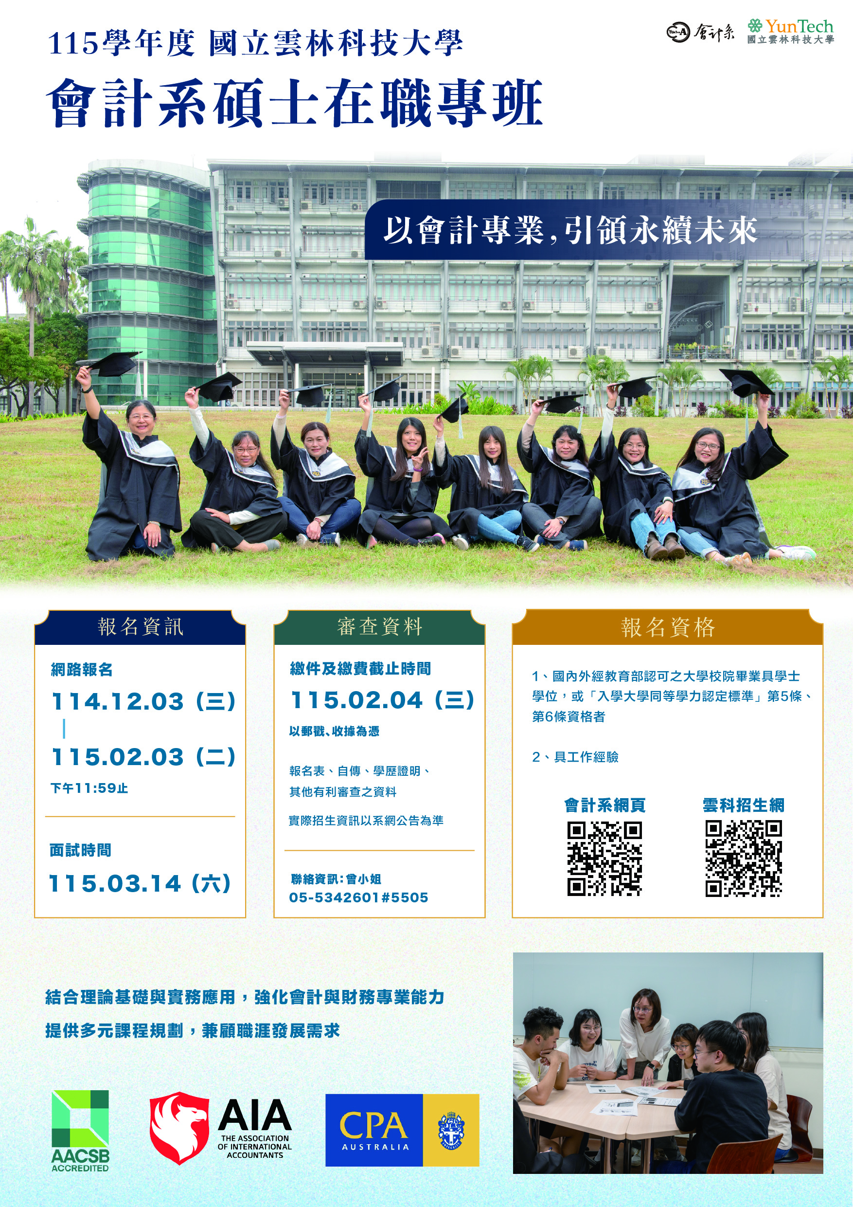 | 一、 | 本校會計系碩士在職專班招生網路報名時間:即日起至115年2月3日(二)下午11時59分止(一律採網路報名)。簡章下載及報名網址:https://examweb.yuntech.edu.tw/WebExams/Exam_W/ |