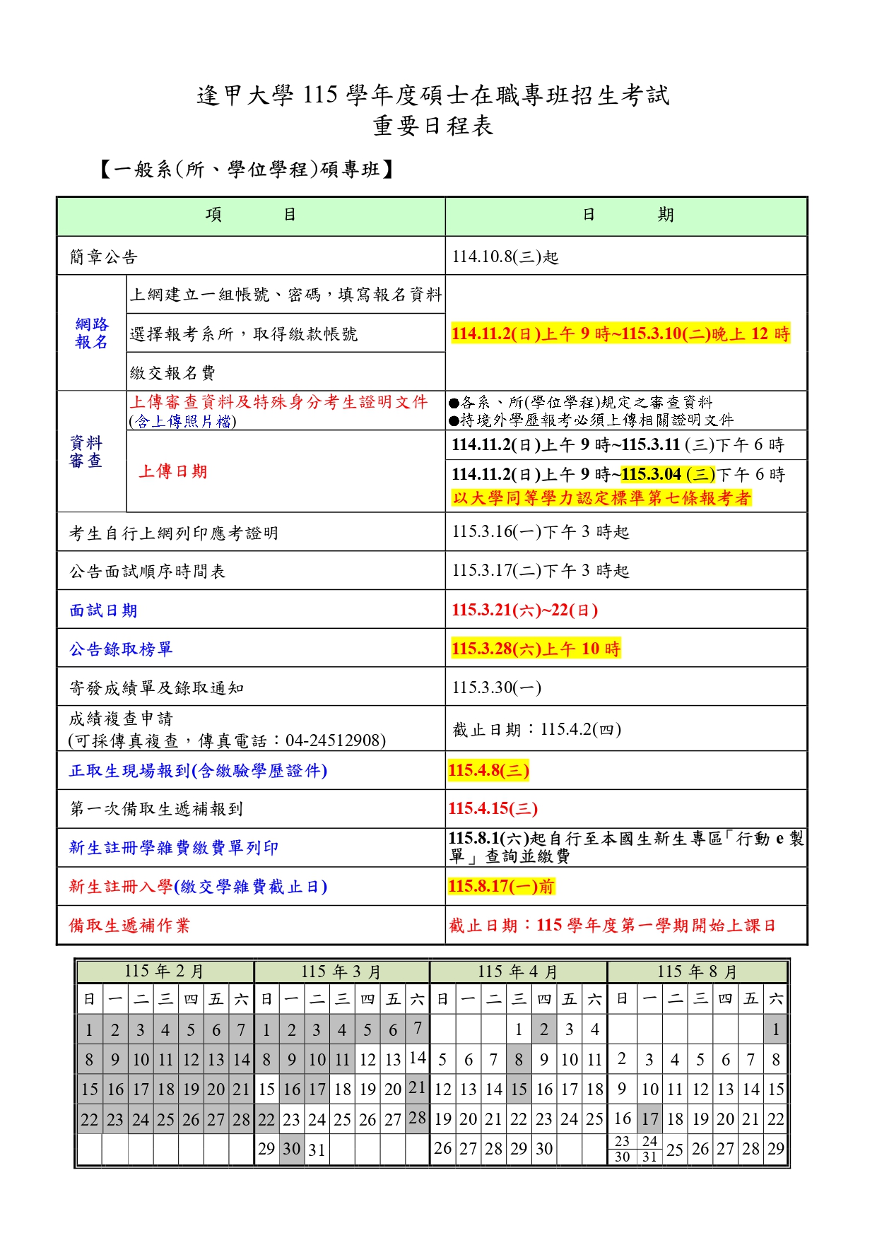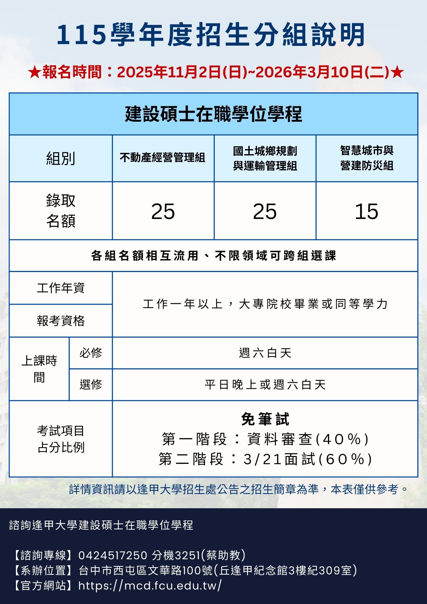 | 五、 | 檢附115學年度本校碩士在職專班招生重要時程(附件一)、本專班簡章(附件二)及電子海報(附件三),若對本專班各組有任何諮詢事項,請致電本碩專班辦公室,電話:(04)24517250分機3251,洽詢蔡小姐。 |