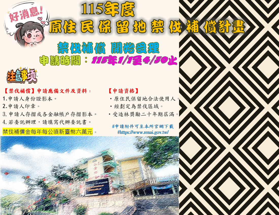 申請方式:提供線上(禁伐補償資訊系統)與臨櫃(仁愛鄉公所)#網址https://www.renai.gov.tw/辦理。