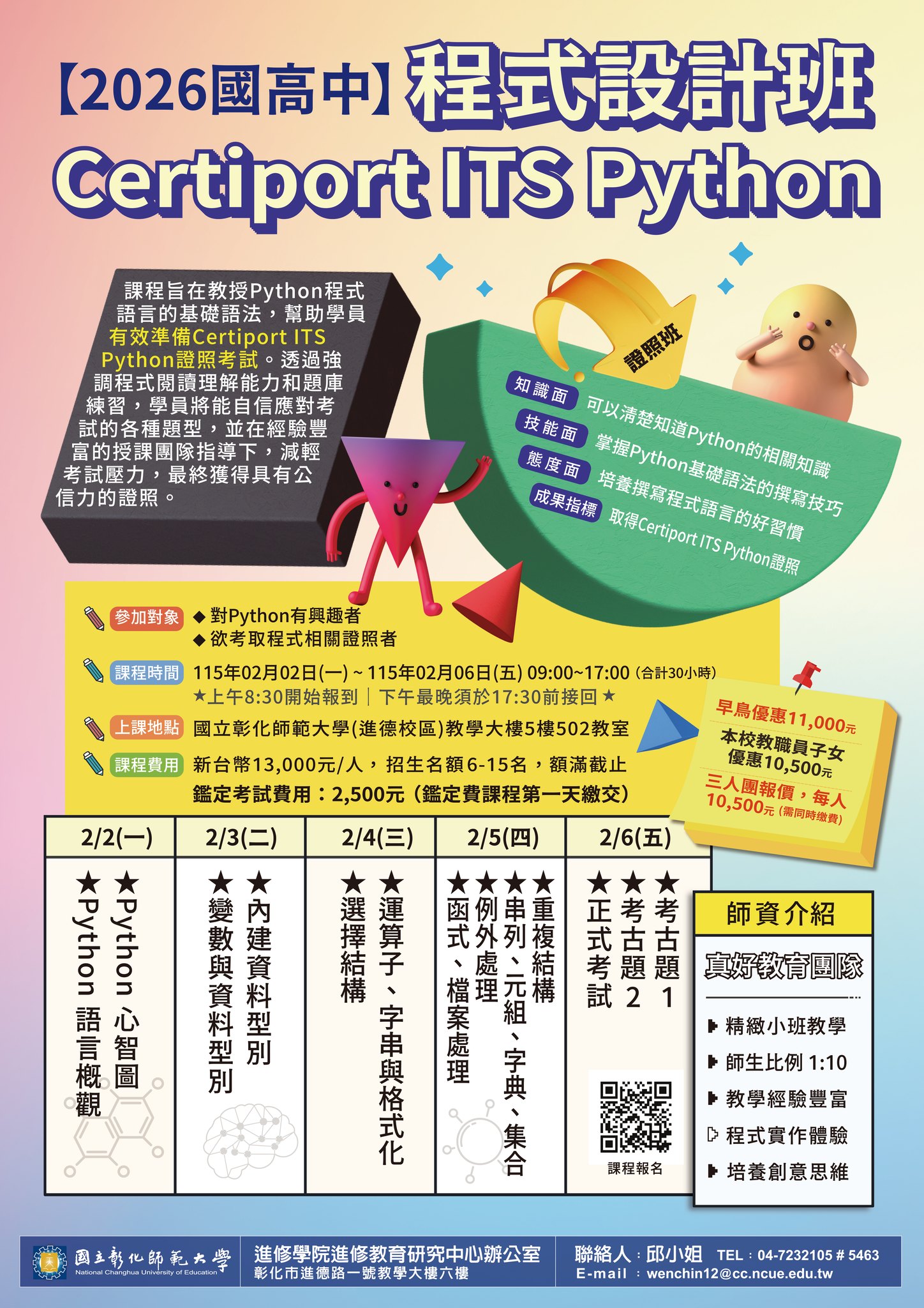 【轉知】國立彰化師範大學 -「【2026國高中程式語言】Certiport ITS Python程式設計班」、「日語會話五十音基礎班」、「日語N3中級Ⅱ班」招生簡章