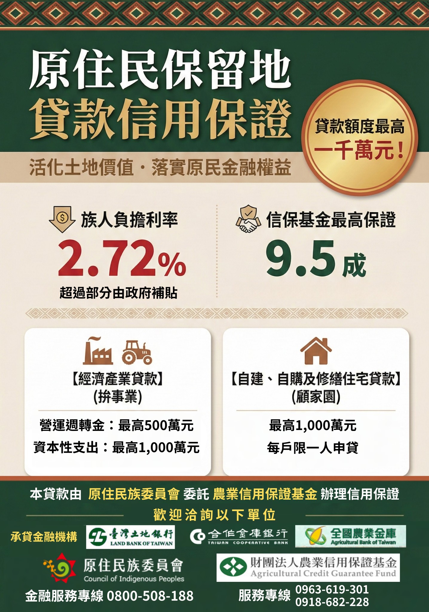 為保障原住民族金融權益,原民會訂定「原住民保留地貸款信用保證作業要點」,委託財團法人農業信用保證基金辦理「原住民保留地貸款信用保證業務」政策說明會,本鄉將於115年3月19日下午兩點於仁愛鄉民代表會旁多功能會議室舉行,邀請部落族人參加瞭解。相關文件如附件