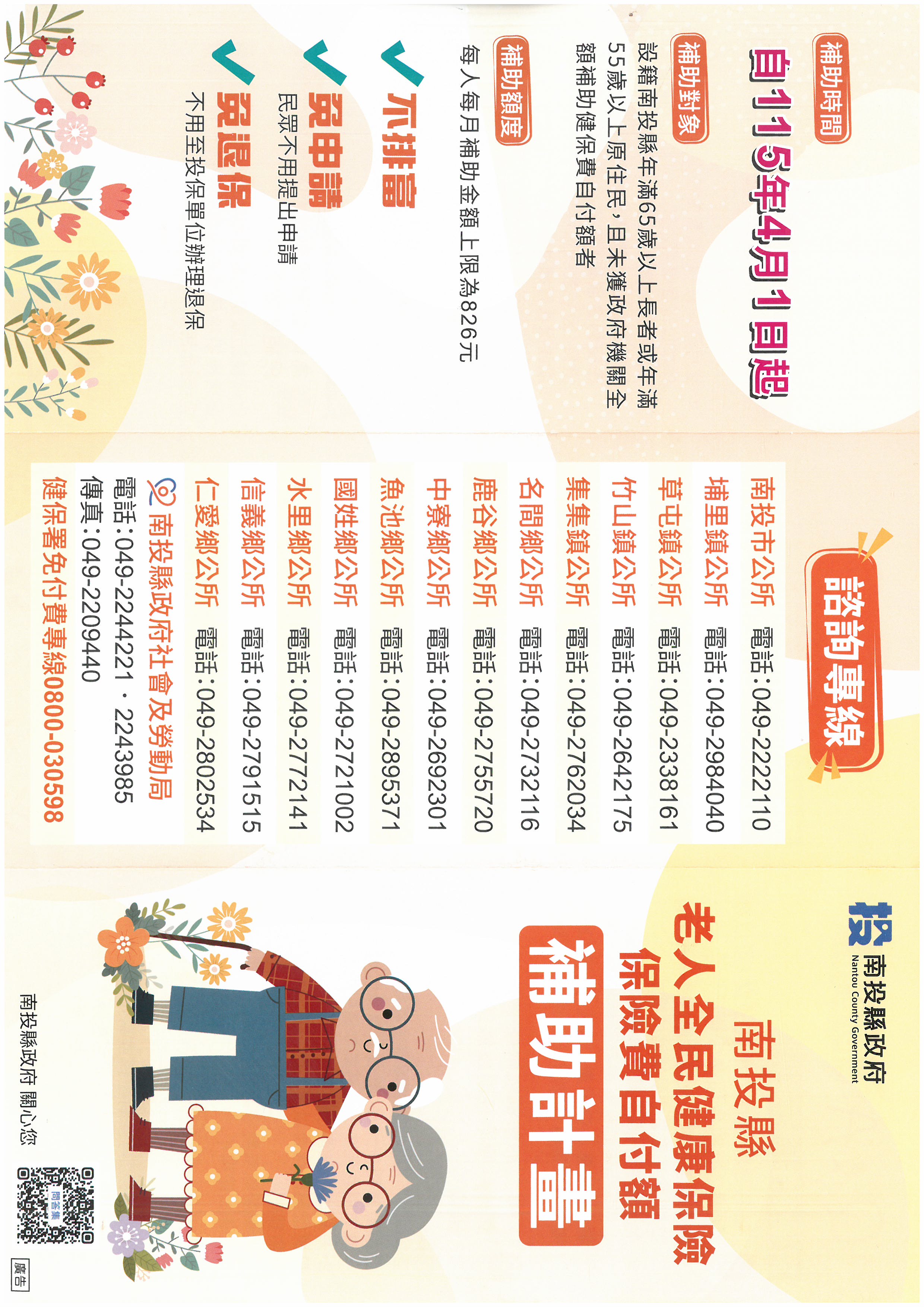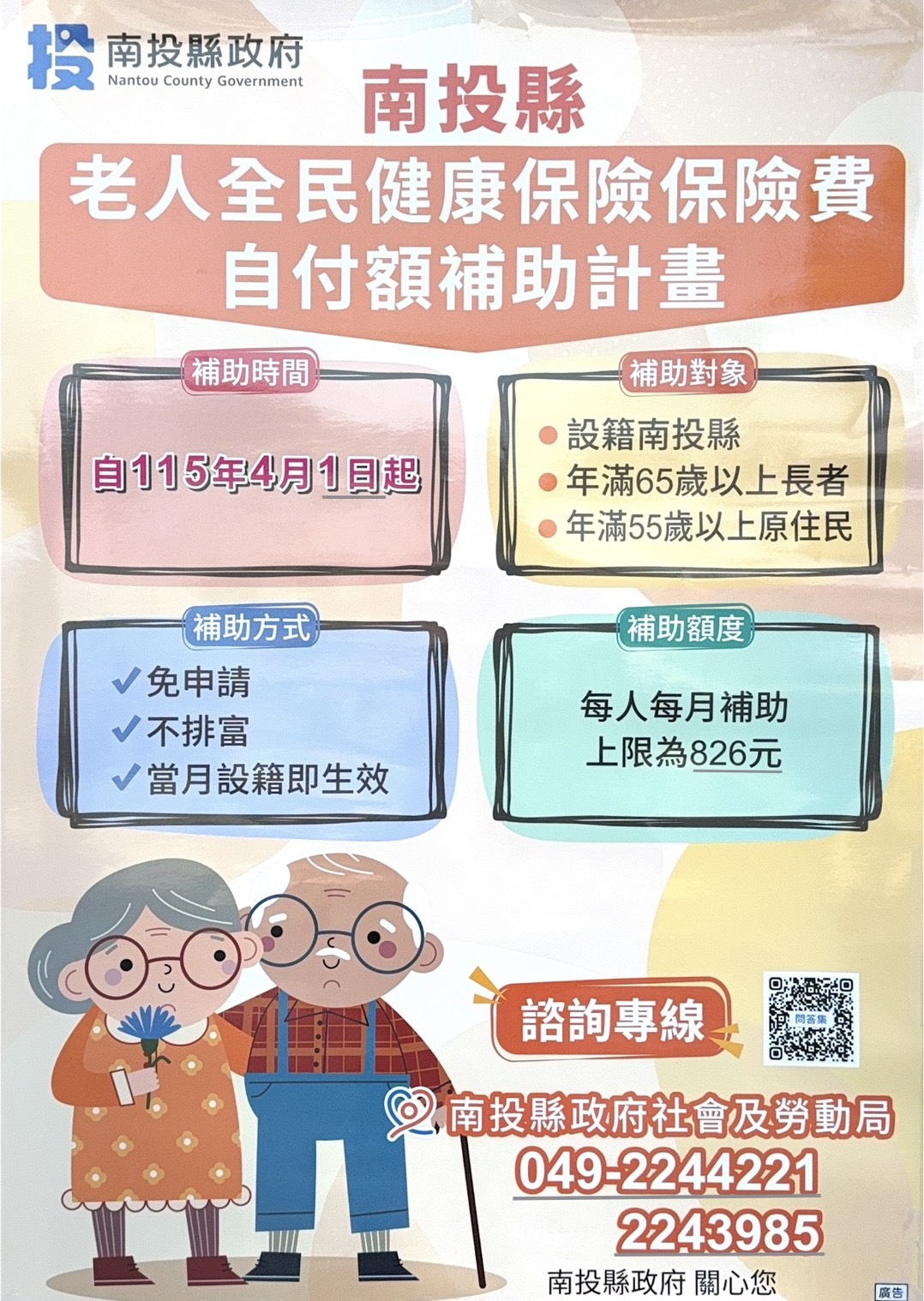 為提升本縣高齡者醫療保障並減輕全民健康保險費自付額負擔,南投縣政府訂定「南投縣老人全民健康保險保險費自付額補助計畫」,並自民國115年4月1日起正式實施,相關重點說明如下: